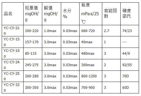 YC-CY 是我公司研發(fā)的聚氨酯原料的總稱, 分為多元醇, 雙組份聚氨酯等品種。 這些原料都是以天然油脂蓖麻油為原料。它充分利用了蓖麻油的低粘度、 低發(fā)泡性、 顏料分散性、 耐水性、 絕緣性能、 耐沖擊性等特點(diǎn), DYC-CY 可廣泛用于生產(chǎn)防腐涂料。 粘著劑、 地坪涂料、 彈性體等多種用途DYC-CY 是一種專用于聚氨酯的蓖麻油多元醇, 它根據(jù)搭配羥基的不同活性, 同時(shí)兼具熱穩(wěn)定性、 耐水性、 耐酸性及耐溶劑等特點(diǎn), 以便于生產(chǎn)出硬度不同的功能性聚氨酯材料。