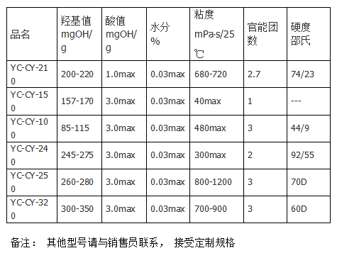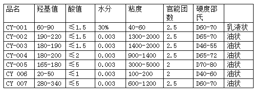 Cy-001-008 是我公司研發(fā)的聚氨酯原料的總稱, 分為油性和水性蓖麻油改性多元醇, 為雙組份聚氨酯等品種。 乳液狀水性蓖麻油改性多元醇可以直接跟MDI攪拌均勻加入顏料反應(yīng)固化,在高溫60-70度下,不會(huì)出現(xiàn)膨脹、裂痕。這些原料都是以天然油脂蓖麻油為原料。它充分利用了蓖麻油的低粘度、 低發(fā)泡性、 顏料分散性、 耐水性、 絕緣性能、 耐沖擊性等特點(diǎn).CY 001-008可廣泛用于生產(chǎn)防腐涂料。 粘著劑、 地坪涂料、 彈性體等多種用途DYC-CY 是一種專用于聚氨酯的蓖麻油多元醇, 它根據(jù)搭配羥基的不同活性, 同時(shí)兼具熱穩(wěn)定性、 耐水性、 耐酸性及耐溶劑等特點(diǎn), 以便于生產(chǎn)出硬度不同的功能性聚氨酯材料。
